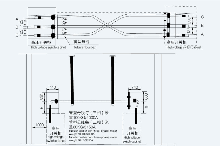 Method 3:Tubular busbars are routed through cable trenches or cable mezzanines This method is the top cable connection method of the switch cabinet. It can also be connected through the cable mezzanine and the bottom cable connection method. Users can choose according to the actual situation. The busbar type is fully insulated. |